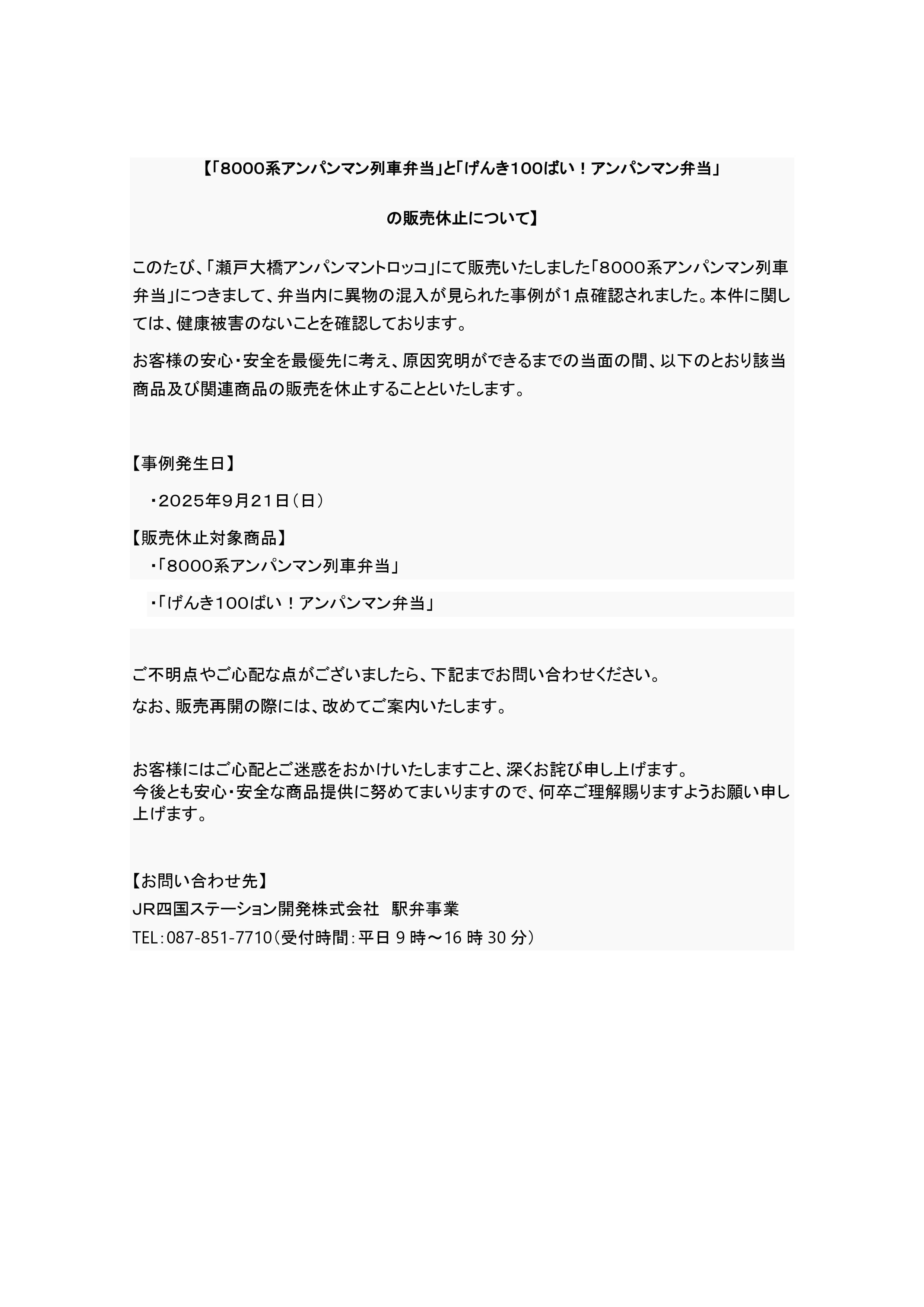 販売中止のお知らせ | 高松駅弁 JR四国ステーション開発株式会社